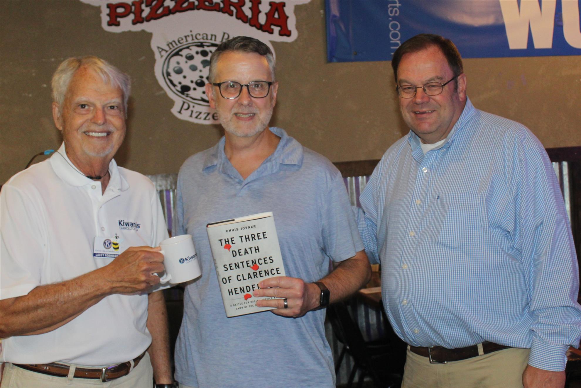 Kiwanians Mike Dugan and Bo Bass welcome UWG Athletic Director and Football Coach Daryl Dickey to the Carrollton Kiwanis Club.